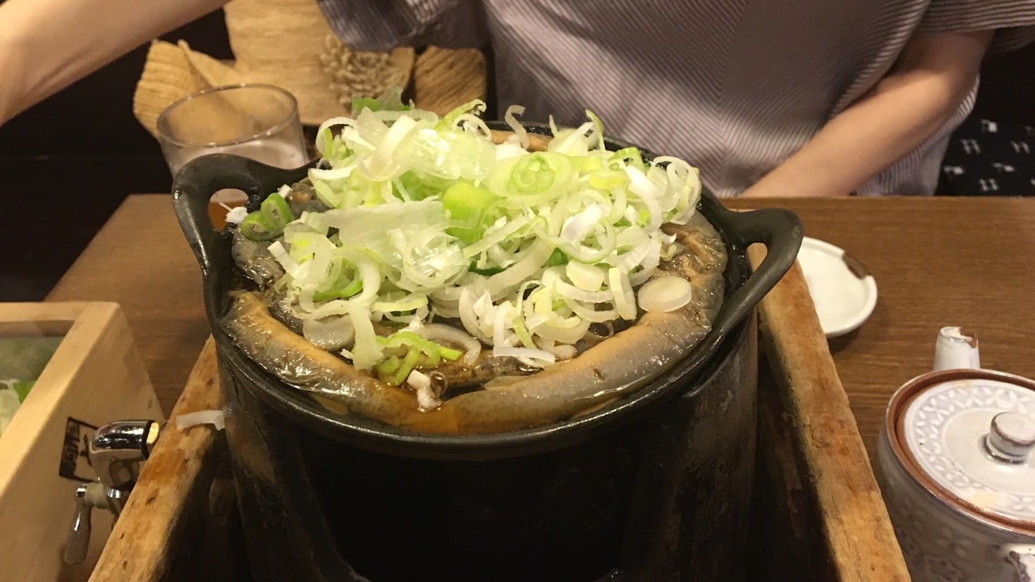 まずは丸鍋.泥を吐かせたドジョウを下処理してありますのでまるごと食べられます.このように大量のネギを載せていただくのが正しい食い方.